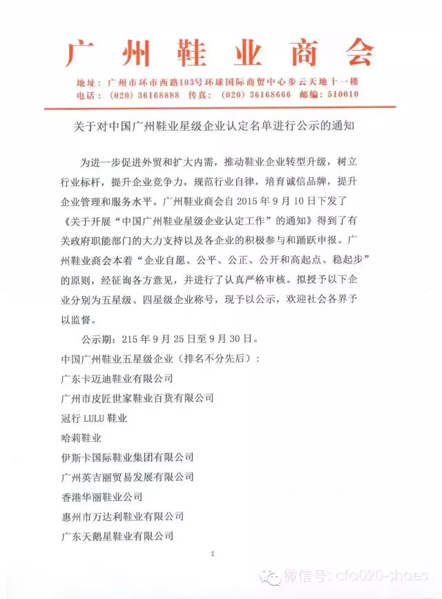 关于对中国广州鞋业星级企业认定名单进行公示的通知