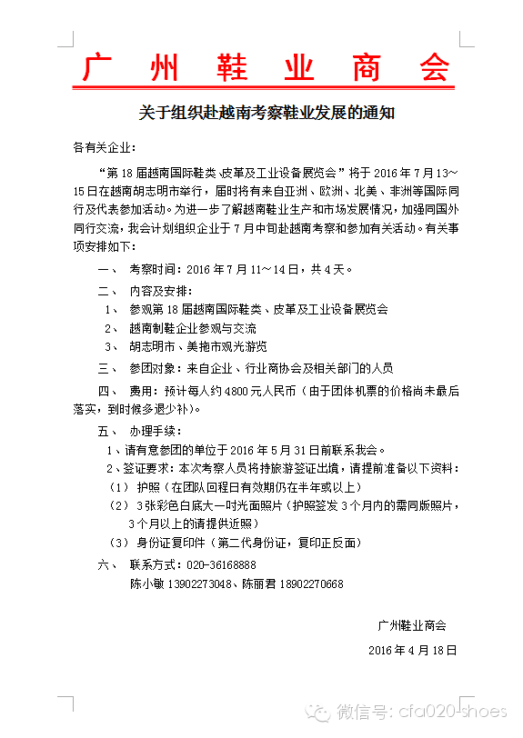 您当前的位置:新闻首页 > 会员动态 > 广州鞋业商会关于组织赴越南考察鞋业发展的通知