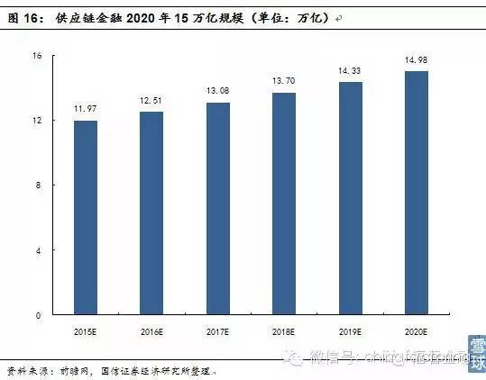 二是以互联网为特征的金融创新在国内如火如荼,已经引领世界潮流,创新工具施用于供应链,全面拓宽了资金来源,突破了美国模式下核心企业自身信用天花板的限制,令金融具备成为主业的可能。目前,中国已经摘得全球供应链业务规模的桂冠,我们预测至2020年,供应链金融业务规模将达15万亿元。