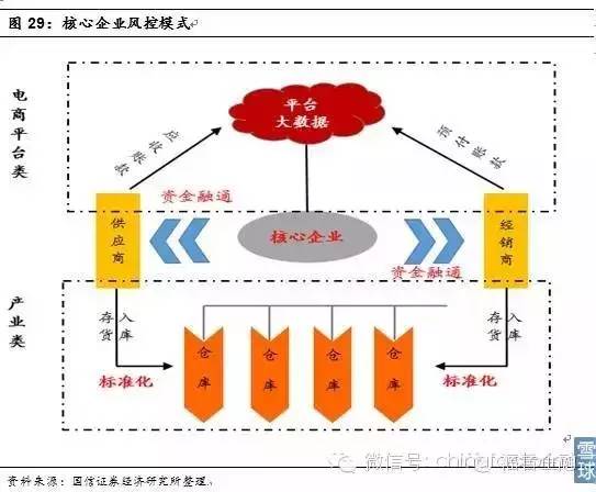 平台类核心企业风控:大数据优势。电商平台类核心企业,拥有更高的业务频次,上下游分别为供应商和消费者,基于应收账款、预付账款贷款以及信用融资是主要形式,风险控制主要依靠平台交易往来所形成的大数据优势,比如京东白条的风控模式。