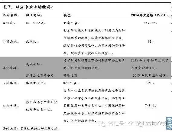 转型路径逐步清晰:互联网化与供应链金融。专业市场受到冲击后,转型方向主要有两个维度,一是顺应电子商务大潮对专业市场进行改造升级,将传统线下业务搬至网上;二是依托供应链金融服务寻求支撑,专业市场掌握大量优质商户资源,以商户为中心,服务上下游融资、物流等需求,将打开转型空间。