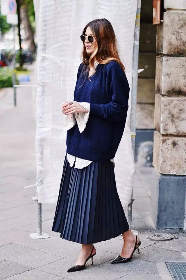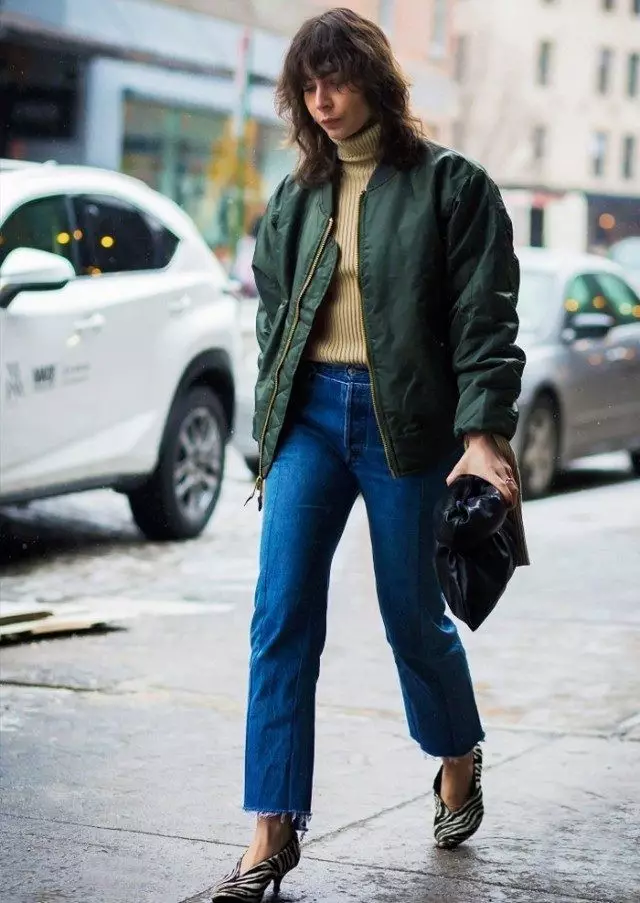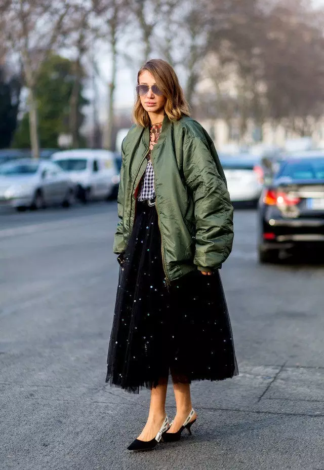 勇於尝试新穿法的时尚女孩,除了利用过膝澎裙搭配上kitten heels之外,外搭一件飞行员外套,创造出衝突感,既帅气又优雅。