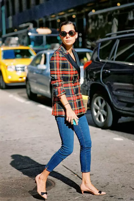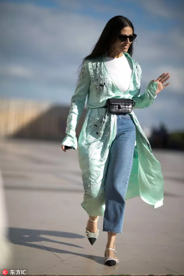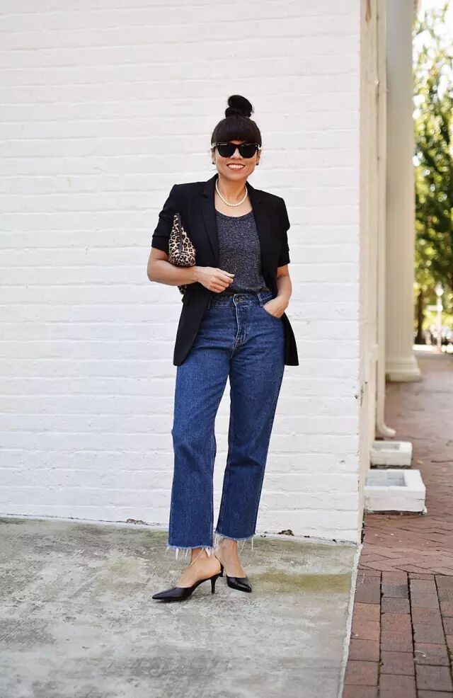 将今年最流行的妈妈牛仔裤,搭配上亮面上衣和西装外套,卷起的袖笼可以让整体造型多了随性的感觉,在穿上一双拖鞋式的kitten heels,轻松自在就可以上街。