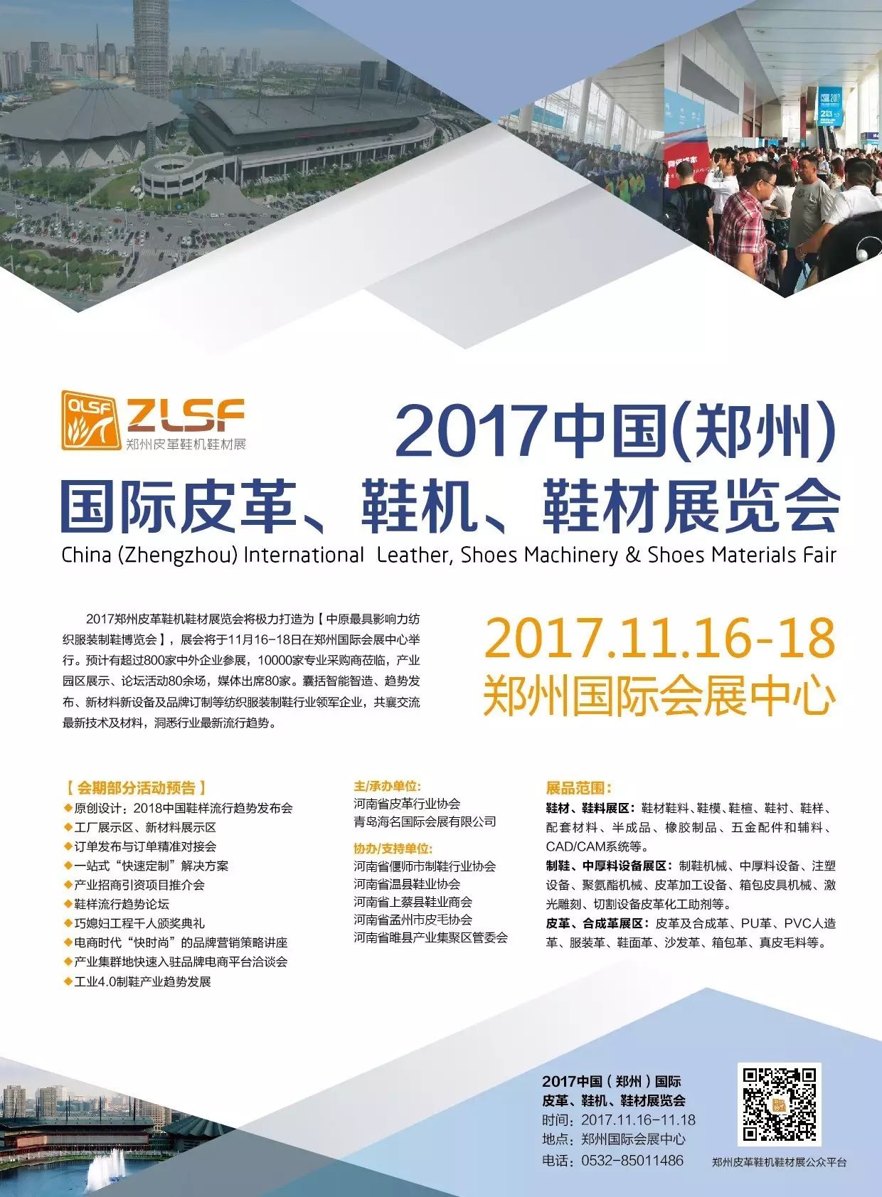 郑州国际皮革鞋机鞋材展览会将于2017.11.16-18在郑州国际会展中心举办,今日起展会准备工作正式启动,展位火爆预定中!电话:0532-85011486