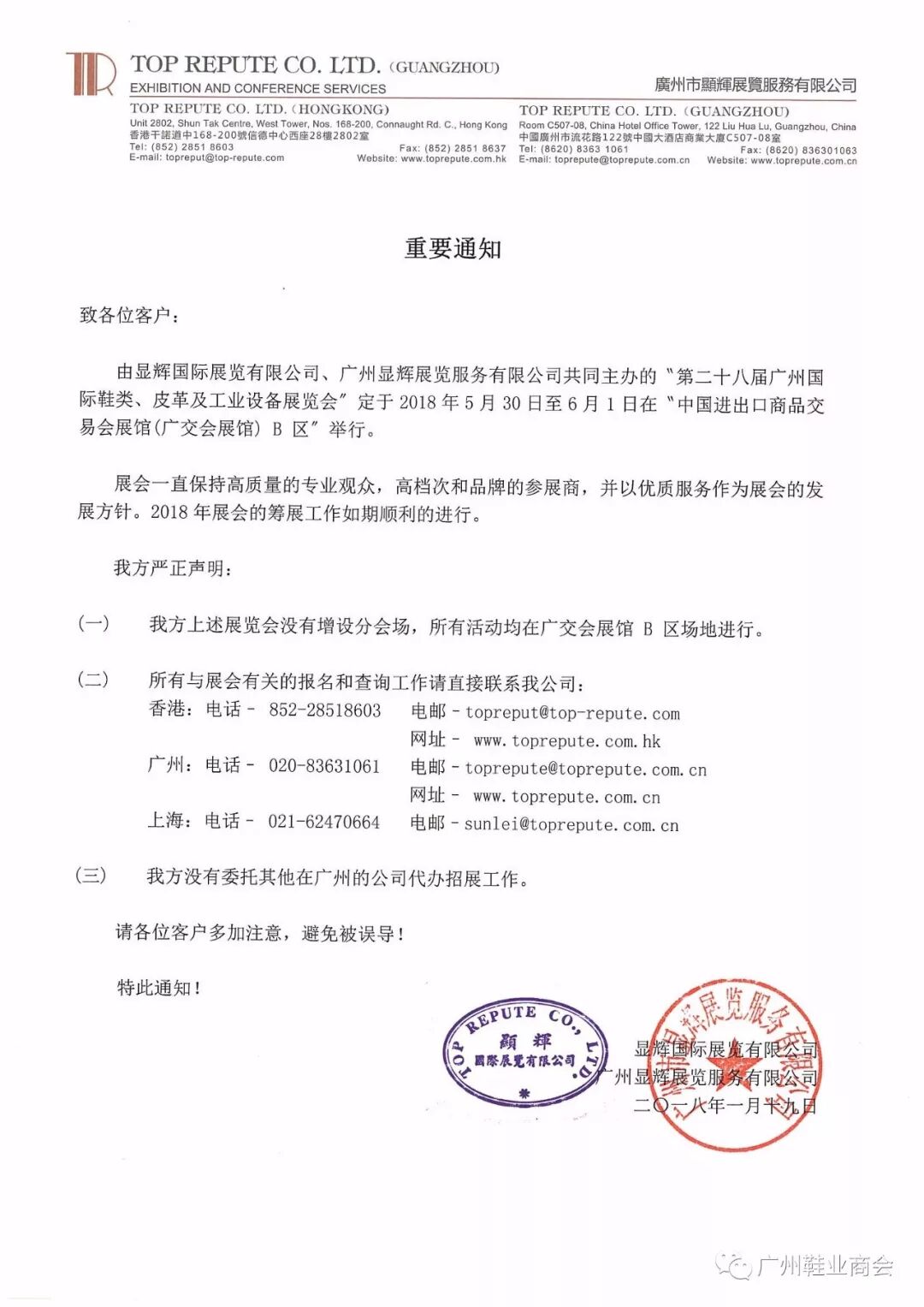 以上为我会荣誉会长企业--广州市显辉展览服务有限公司发布的一份重要通知,请各会员单位多加注意,年末将至,避免上当受骗!
